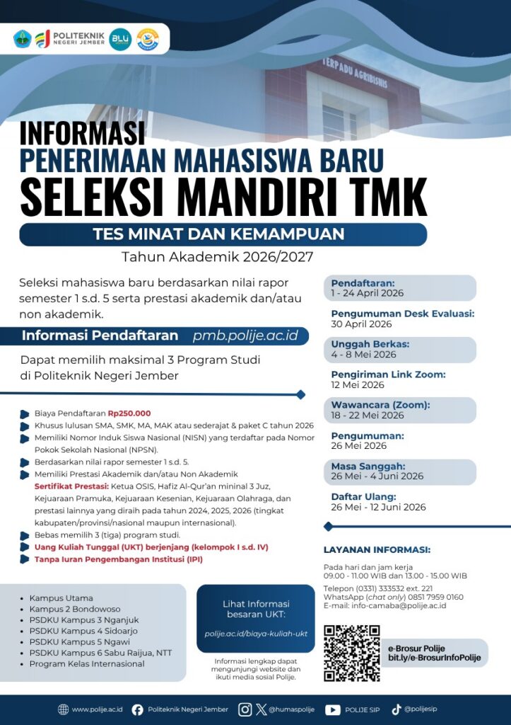 Pilih jalur seleksi yang paling sesuai dengan profil dan prestasi Anda. Politeknik Negeri Jember menyediakan dua jalur seleksi mandiri