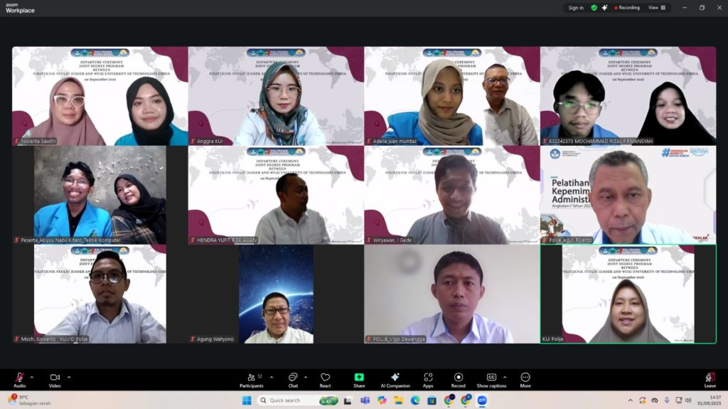 Politeknik Negeri Jember (Polije) menggelar pelepasan virtual bagi empat mahasiswa D3 Teknik Komputer yang akan mengikuti Joint Degree Program dengan Wuxi University of Technology (WXUT) di China. Acara ini berlangsung melalui Zoom pada Senin (1/9/2025) pukul 14.00 WIB, dengan dihadiri pimpinan Polije, pejabat akademik, dosen, orang tua, serta mahasiswa peserta program.