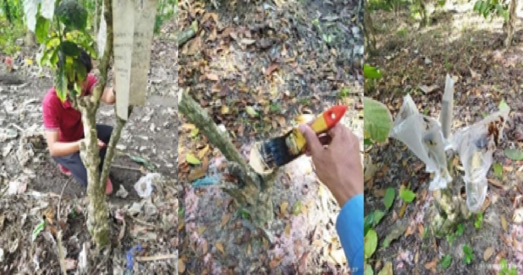 Tim kemudian menutup luka pangkasan untuk mencegah penguapan berlebih dan infeksi. Selanjutnya, mereka membentuk dua batang pokok yang kuat agar tanaman dapat kembali berproduksi optimal.
